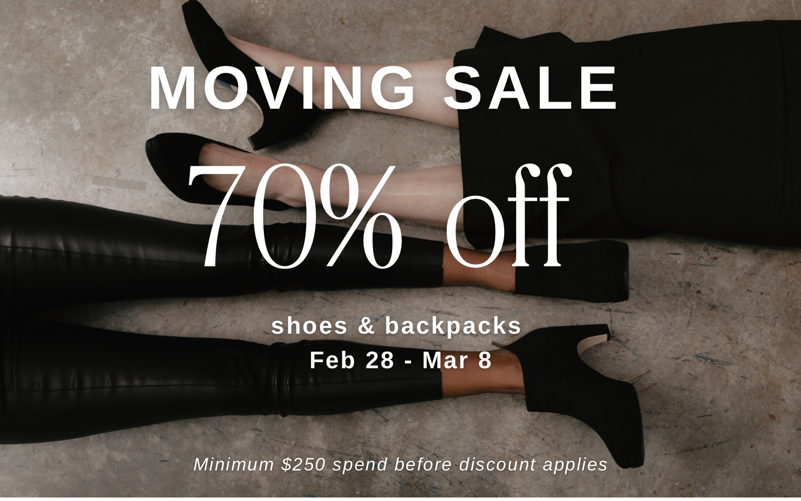 Enjoy 70% off all shoes and backpacks during our limited-time Moving Sale Feb 28 – Mar 8. A minimum purchase of $250 before discount is required for the promotion to apply. Discount automatically applied at checkout.